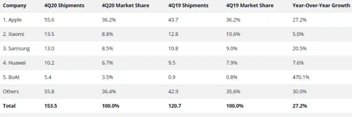 该部门的收入同比增长了27.2%,而全年的出货量则增长了28.4%,达到了4.447亿台。该报告指出,该季度主要受到新设备的到来和较低价格的推动。报告进一步指出,2020年消费者在电子产品上的支出激增,因为“可支配收入是在大流行期间从休闲活动中重新分配的”。 在本季度,苹果再次引领了市场。该公司在上述季度中拥有36.2%的市场份额。IDC指出,其Watch出货量增长了45.6%。尽管同比增长下降了22%,但本季度的可听设备出货量也激增。最近两个季度分别录得28%和29%。 小米以5%的年增长率位列第二。IDC指出,“小米乐队”(Mi Band)阵容本季度下降了18.3%。可听的阵容推动了整体增长,自去年以来增长了55.5%。该公司还利用了华为在不同市场的衰落。 三星以其各个品牌的880万台的出货量位居第三。随着中国公司继续努力应对美国政府的制裁,华为在第四季度滑落至第四位。 新季度的选择是印度初创公司boAt。该公司在2020年下一个季度以540万台的销售量进入前五名。IDC指出,BoAT仅在印度运营,并且广泛关注可听空间。该公司可能会在主要由国际品牌主导的全球可穿戴设备市场中面临挑战。 |