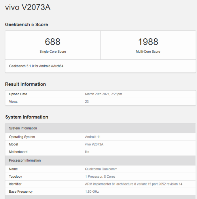 | Vivo将在3月25日宣布其受欢迎的子品牌iQOO Z3的新设备。今天出现在Geekbench列表中,并带有预期的手机规格。